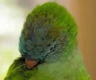 Oliver, a blue-crowned conure, likes to swing from the bottom of his open cage door by one foot for as long as the applause lasts.